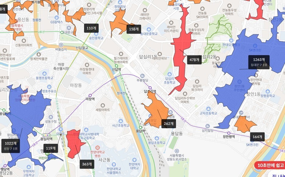 또한 교육 시설에 대한 접근성은 좋지 않습니다. 가장 가까운 답십리초등학교는 동대문구에 속해 배정 받기 어렵고, 마장초등학교로의 이동 경로가 복잡하며 거리적으로도 먼 편입니다. 용답초등학교까지의 거리도 상당히 멀기 때문에 초등학생의 통학에는 어려움이 예상됩니다. 학원가 접근성 역시 부족한 편입니다.