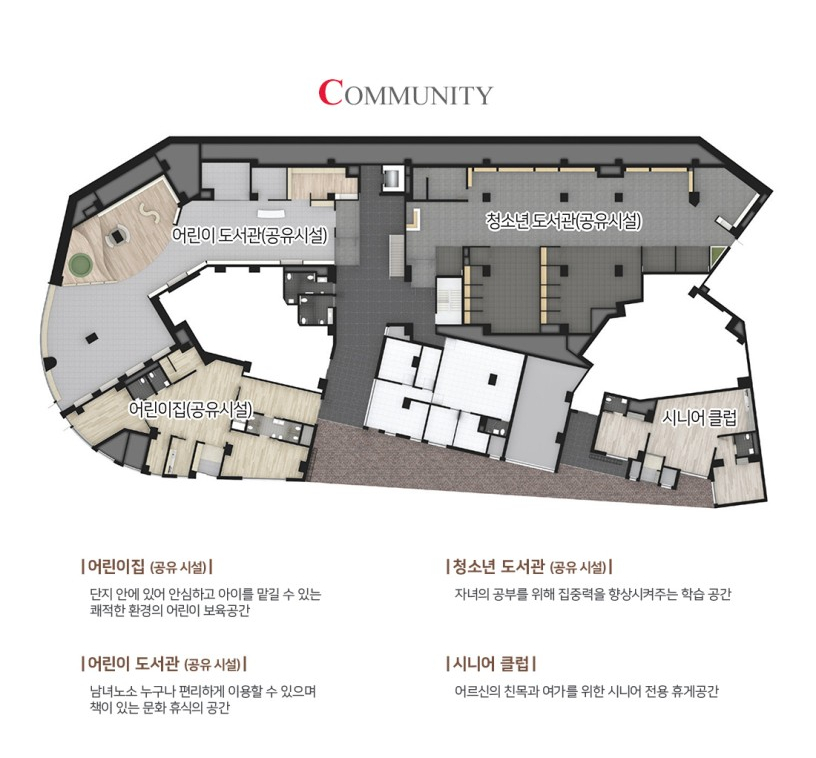 커뮤니티 시설도 대부분 부족한 상태로, 공용으로 이용 가능한 도서관과 시니어 클럽을 제외하고는 거의 존재하지 않는 것으로 보입니다. 이러한 조건 하에 밤에는 단지 내 주차공간이 부족해 판매시설 주차장을 활용해야 할 수도 있겠습니다.