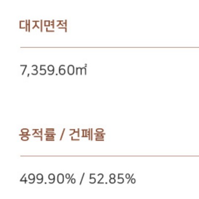 이 단지는 총 400세대 정도로 구성되어 있지만, 용적률이 500%, 건폐율이 52.8%로 상당히 높아 대지 면적이 제한적입니다. 실제로 대지면적은 가로주택정비사업 수준에 가까운 좁음을 보입니다.